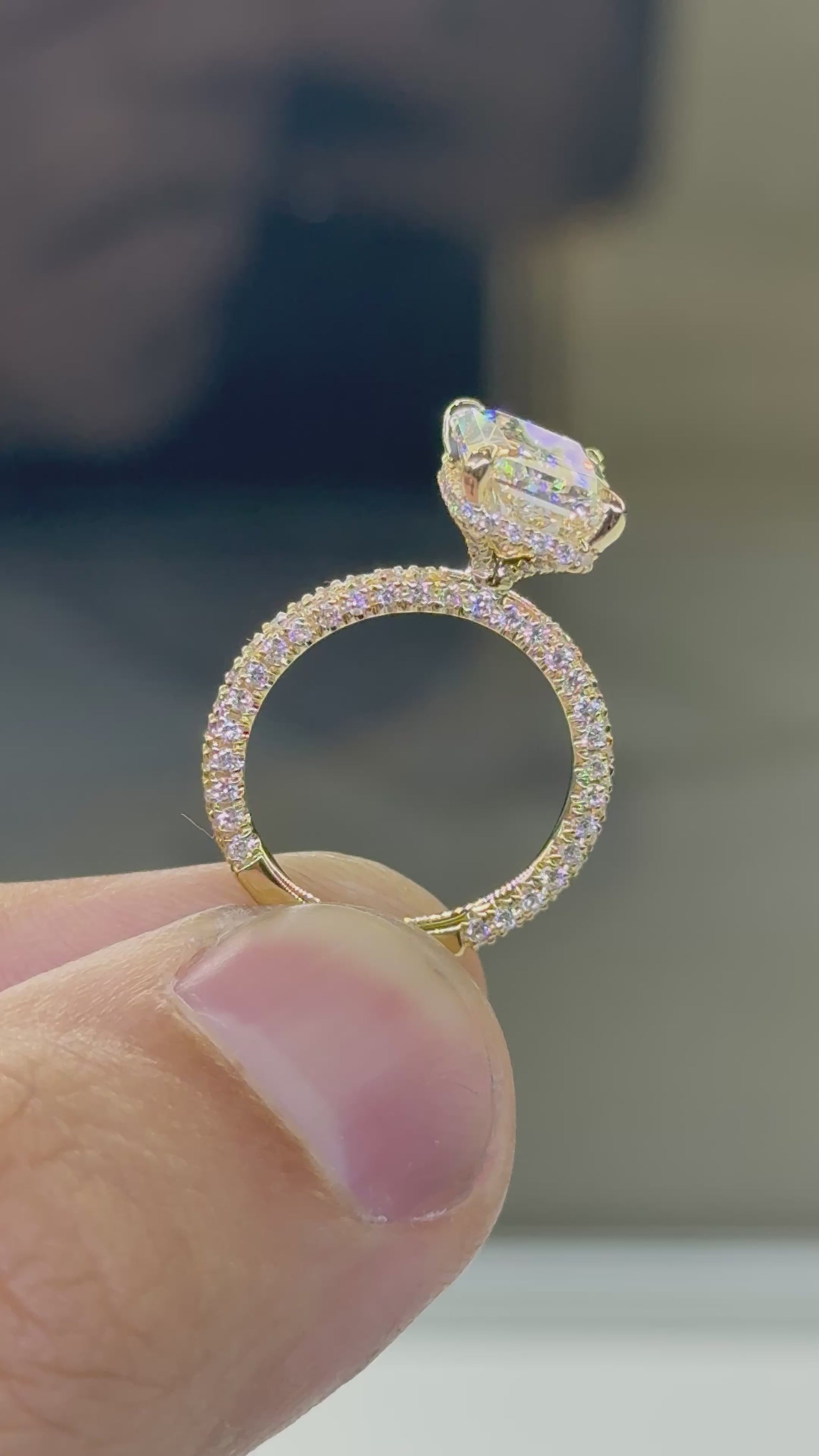 The contemporary 2.40mm 3D pavé band wraps the finger in continuous sparkle, while the hidden halo beneath the center stone adds a subtle, luminous glow that enhances the radiant cut’s natural intensity. The result is a captivating fusion of modern structure and timeless luxury.