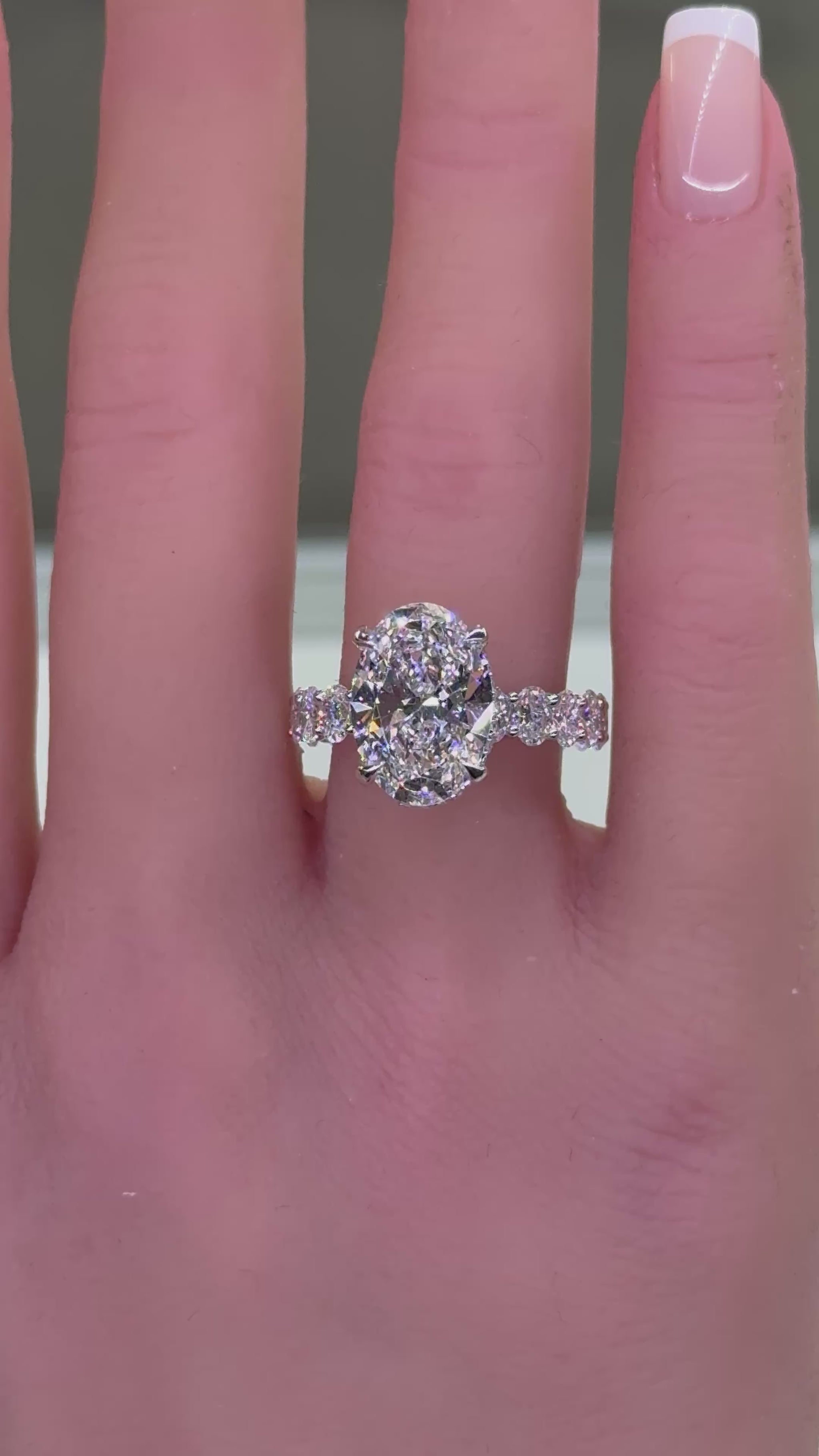 A true masterpiece of elegance and radiance, The Gabriella features an oval brilliant laboratory-grown diamond center stone, framed by a band of 4mm oval brilliants, totaling 2.40 carats of dazzling accent diamonds. Designed with a Signature Hidden Halo, this setting enhances brilliance from every angle, creating a seamless and captivating glow.