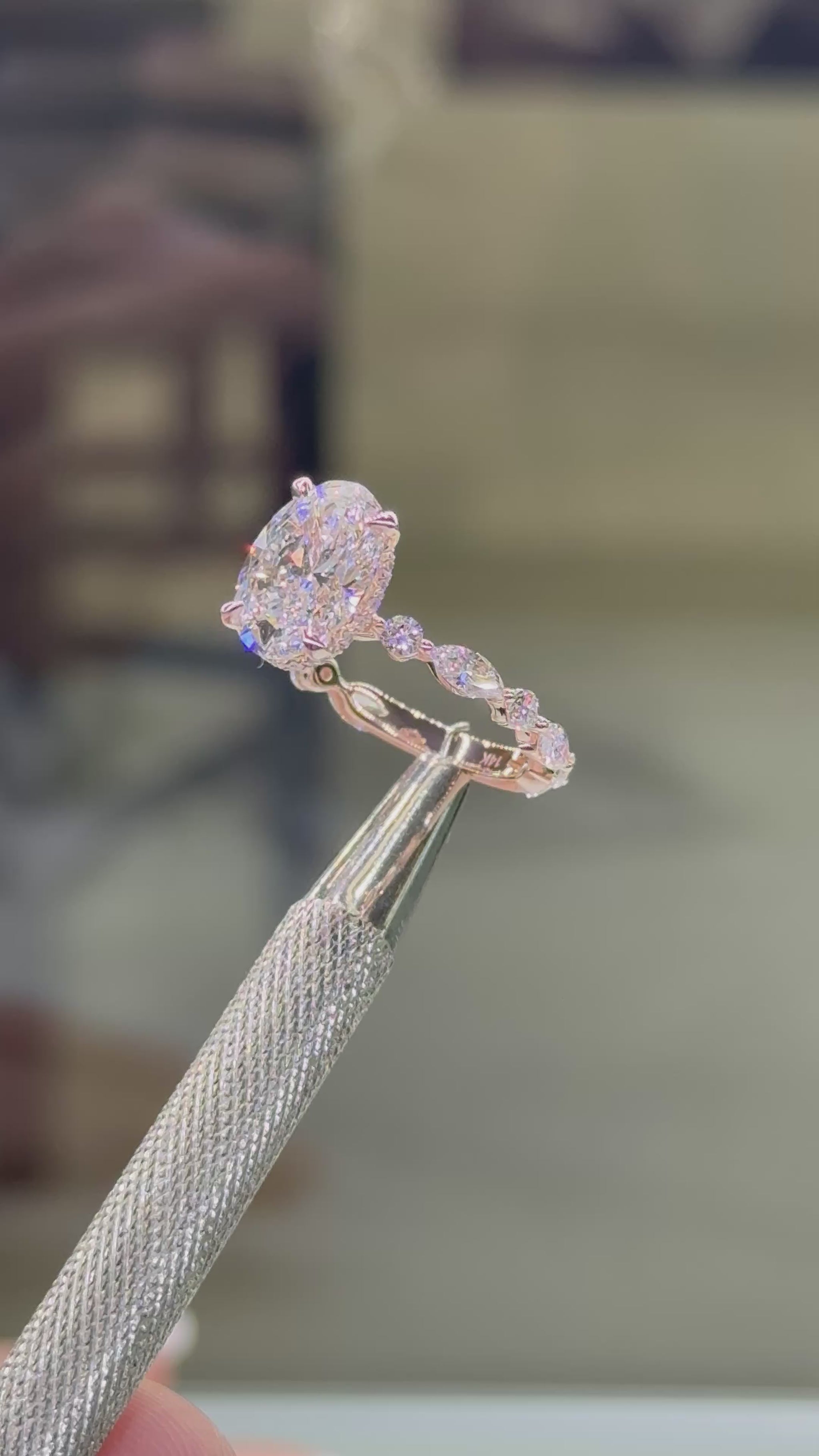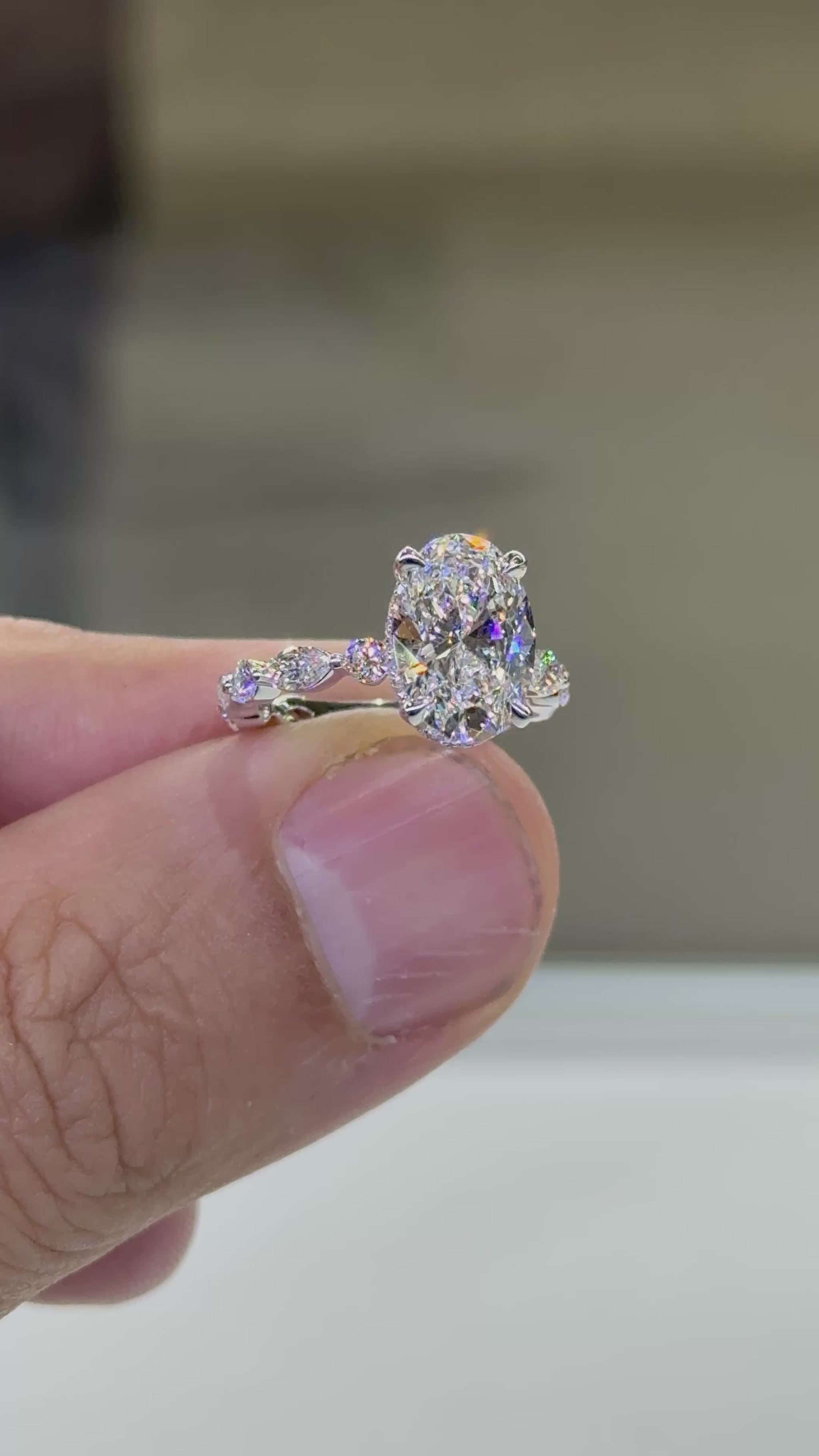 A breathtaking blend of classic elegance and modern brilliance, The Giana features an oval brilliant laboratory-grown diamond, set in an exquisite Marquise & Round Hidden Halo setting. Designed to enhance its natural radiance, this setting is adorned with 1.50 carats of marquise and round brilliant laboratory-grown diamonds, adding depth, dimension, and a captivating sparkle from every angle.