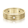 A bold modern men’s wedding band featuring a brushed satin finish accented by three sleek horizontal grooves and evenly spaced bezel-set round brilliant diamonds. The combination of structured linework and subtle diamond brilliance creates a sophisticated, contemporary look with strong masculine presence. Designed with a comfort-fit interior for smooth, effortless wear.